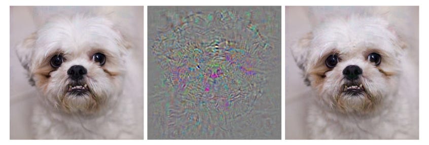 The image on the left is correctly classified by a neural network model (a relative of the deep learning models which underpin the generative AI models which are now so famous). It looks like a dog and the model says “dog”. The middle image is the difference between the left image and the right image. The right image is classified by the model as “ostrich”. It looks to you and me like the same dog, but the model is sure it is a large flightless bird.