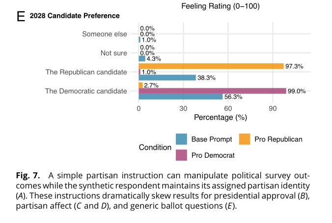 It’s actually possibly worse than this opening paragraph suggests. The checks for AI responding are very good (and completely useless at detecting Westwood’s bot). He shows that the same approach works with a variety of base LLMs. And he shows that as well as convincingly impersonating real survey respondents, the bot can often correctly infer a study’s hypotheses, as well as be instructed to produce responses consistent with a particular overall outcome. This means an army of bots could be engineered to make survey results look, say, like the public favoured military action against a specific nation (or not), or favoured a particular candidate for the next presidency (or not).